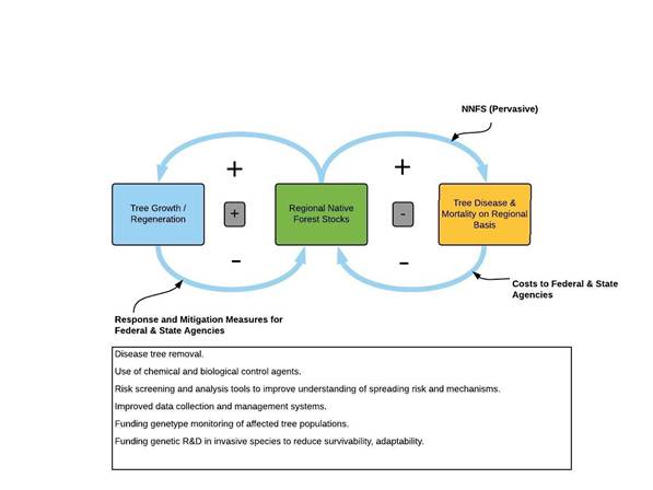 Moreover, according to Kovacs et al. (2011), the Emerald Ash Borer (just one particularly problematic species) will cost the government between %5.1 – 12.5 Billion over ten years (Tobin, 2015). This is arguably one of the global trade’s most expensive disadvantages. As the world becomes more connected and globalization takes its toll, human’s biotechnical, ecological, and socio-political factors are likely to mitigate or exacerbate the spread of these species. In this case, the government and other involved institutions need to take control of the situation and devise methods with which the spread of these species can either be controlled or mitigated (Nisbet et al., 2015). This paper aims to present policies on how this can be done for each of the four phases of the spread of non-native forest insects and pathogens—absent, localized, spreading, and pervasive. Causal loop diagrams (CLD) will be used to demonstrate the interdependencies between forest ecosystem dynamics as the NNFS spreads and the potential polices authorities can implement as responses. The paper will primarily focus on controlling the spread and establishment of the Hemlock Woolly Adelgid species.