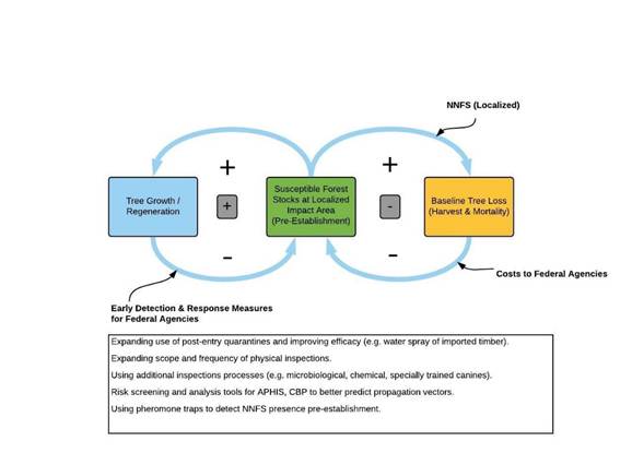 Since their spread is linked to global trade, one policy that the government has adopted is incorporating effective protection and detection mechanisms within the international trade agreements. Some of the policies adopted include the Sanitary and Phytosanitary Measures (SPS), which is similar to the “polluter pays” principle in matters of pollution (Aukema et al., 2005). Here, the exporting country is expected to apportion funds and implement measures that prevent activities that can increase the risk of NNFS hitchhiking (Tobin, 2015). Another policy is by importing countries implementing stringent measures such as inspections by customs and heating or chemically treating materials that are at high risk of introducing these species into the environment. Another ingenious method observed is countries monitoring the long term and short-term risks of NNFS by establishing sentinel tree programs in exporting countries (Tobin, 2015). Currently, the US has similar programs studying the effects of Hemlock Woolly Adelgid in countries such as Japan and others in Asia (Emilson & Stastny, 2019). This allows them to monitor how these pests affect the botanical gardens and therefore help countries prepare for the potential side effects they might have if they successfully establish themselves. The CLD diagram below showcases these and other policies the government can implement to help achieve this and how they relate to the ecosystem dynamics.